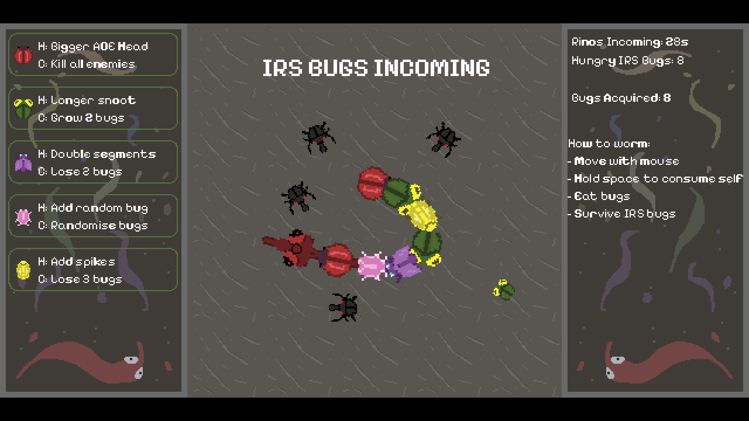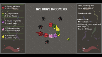 You are a worm following your desire to loop and nom... Until the IRS rhino bugs show up. But of course, even after they take all your hard earned bugs they will be back. So it is up to you to survive the never ending loop of paying taxes (getting raided) and eating enough bugs to make it to the next payment. Have fun!!